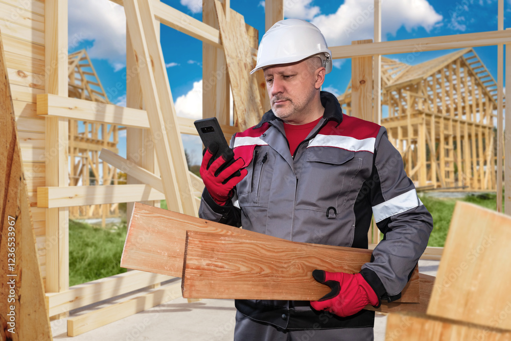 Man contractor for construction company. Phone in hand builder. Construction foreman holds boards. Erection building. Contractor man stands in wooden house under construction. Builder in gray uniform