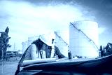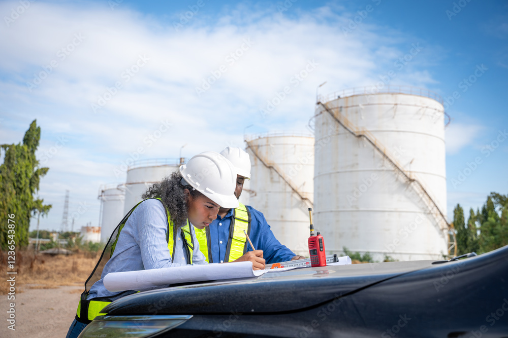 Engineers africa worker wearing examining survey checking blueprint standing in front of car Industrial chimneys facility gas or oil refinery engaged in a job requires high safety standards concept.
