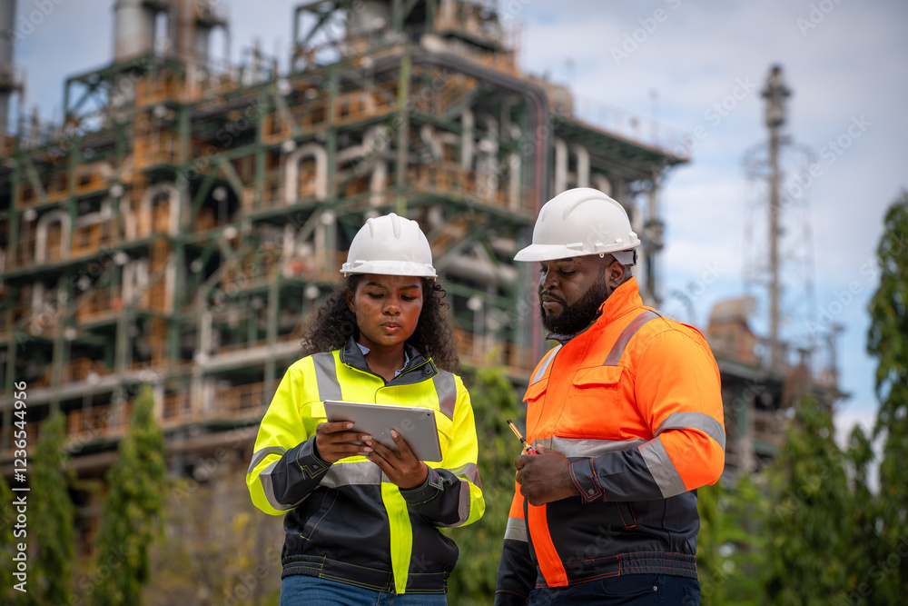 Engineers wearing safety gear, including hard hats examining survey standing industrial facility gas or oil refinery engaged in a job requires high safety standards concept.
