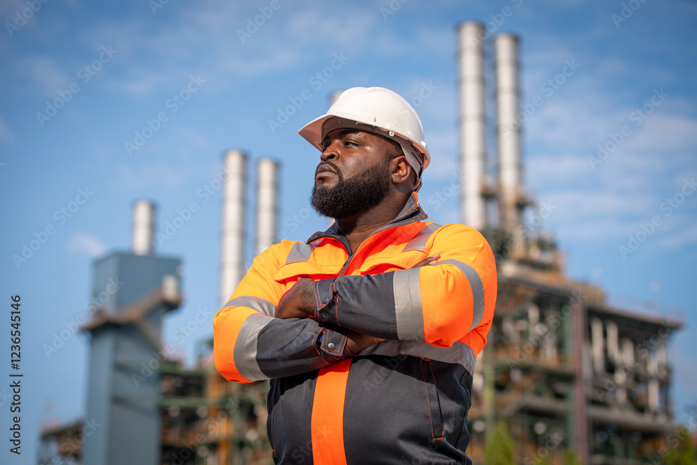 Engineers wearing safety gear, including hard hats examining survey standing industrial facility gas or oil refinery engaged in a job requires high safety standards concept.
