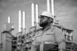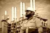 Engineers wearing safety gear, including hard hats examining survey standing industrial facility gas or oil refinery engaged in a job requires high safety standards concept.