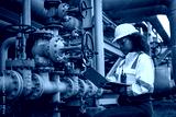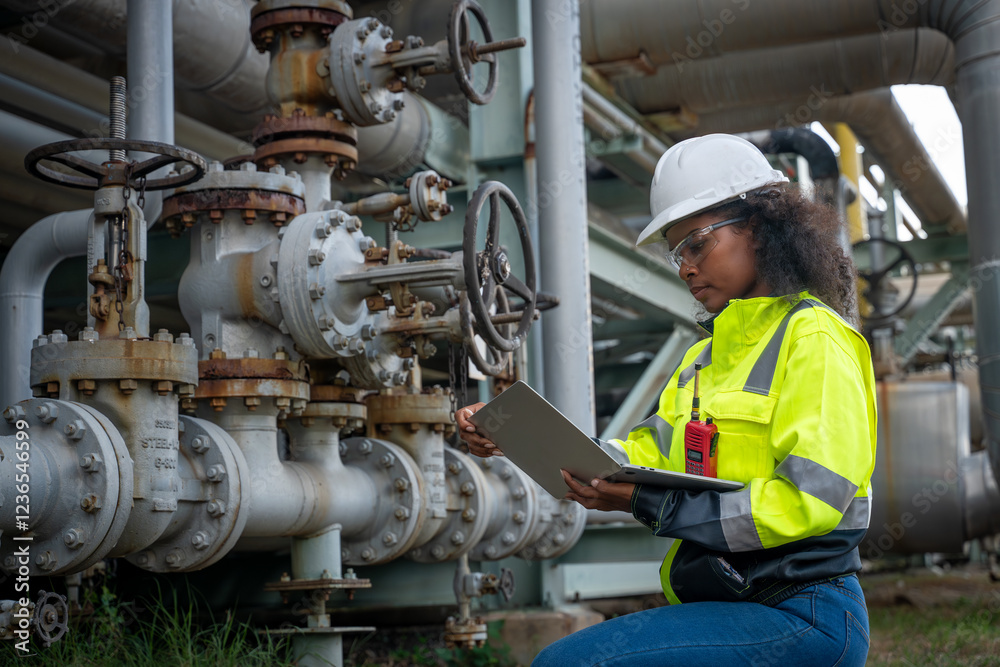 Engineers or industrial worker at large metal pipelines and valve systems oil refinery, chemical plant, or gas processing facility analyzing data is industrial safety, and operational efficiency.