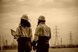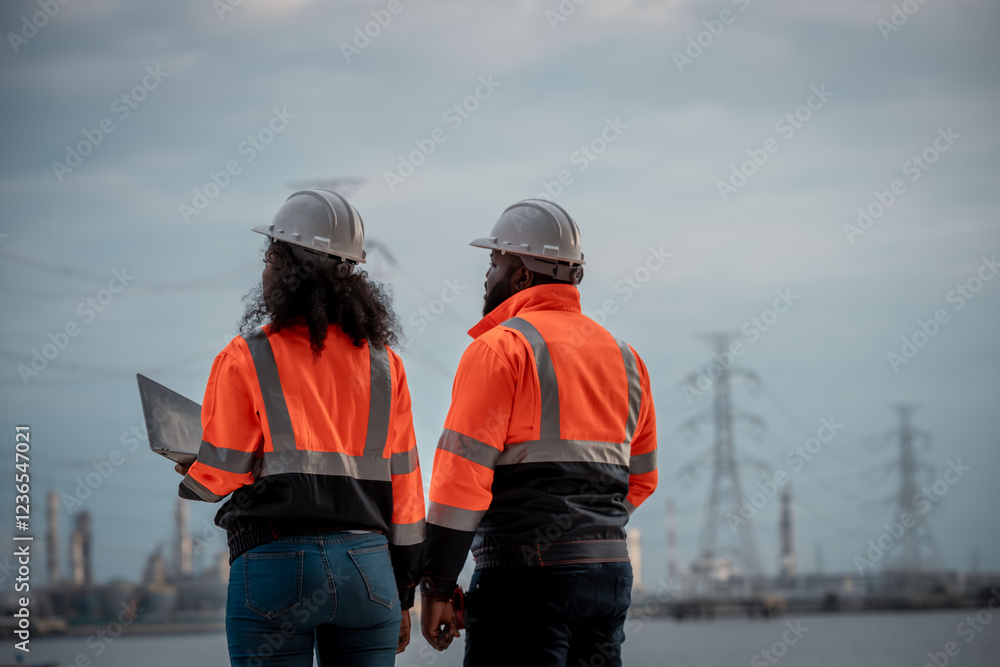 Engineers wearing safety gear, including hard hats examining survey standing industrial facility gas or oil refinery engaged in a job requires high safety standards concept.