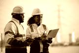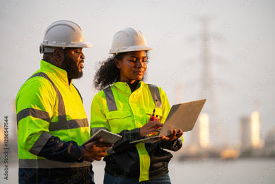 Engineers wearing safety gear, including hard hats examining survey standing industrial facility gas or oil refinery engaged in a job requires high safety standards concept.