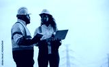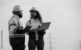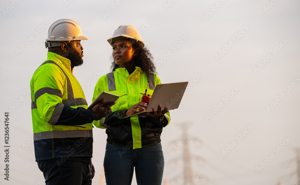Engineers wearing safety gear, including hard hats examining survey standing industrial facility gas or oil refinery engaged in a job requires high safety standards concept.