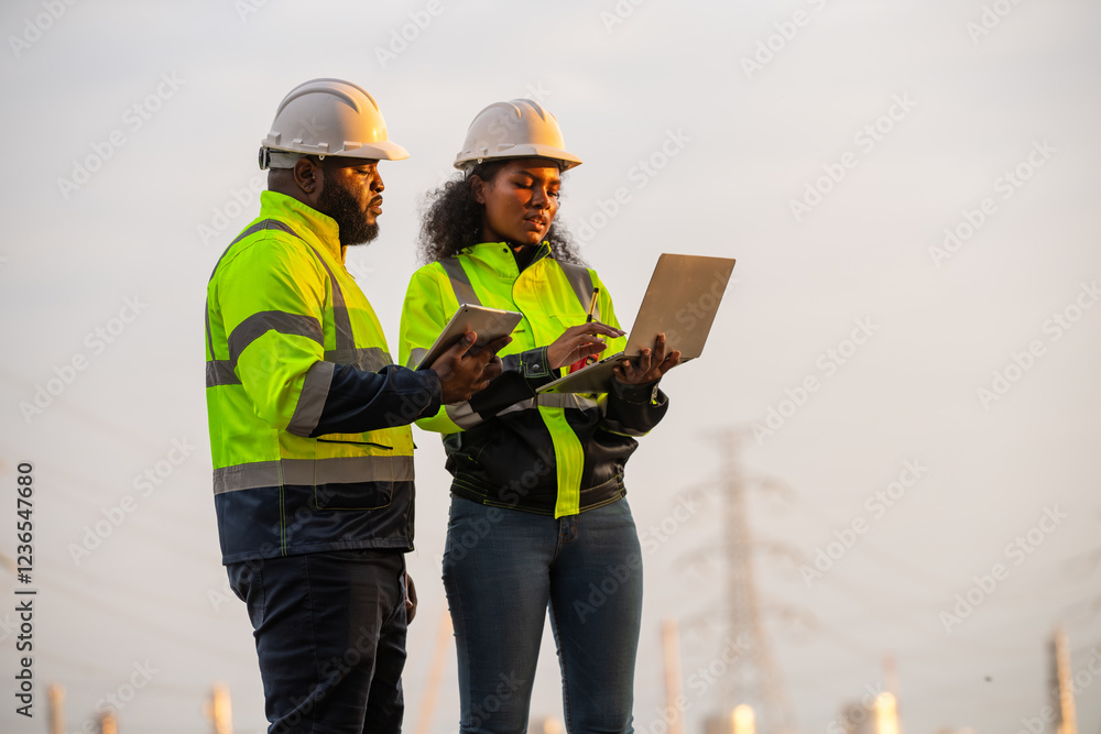 Engineers wearing safety gear, including hard hats examining survey standing industrial facility gas or oil refinery engaged in a job requires high safety standards concept.