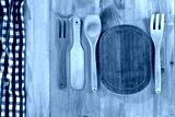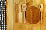 Kitchen utensils on wooden background. Wooden table with copy space for text and products placement.