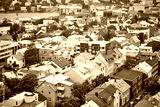Aerial scenic view of Reykjavik, Iceland on a foggy and rainy summer day.