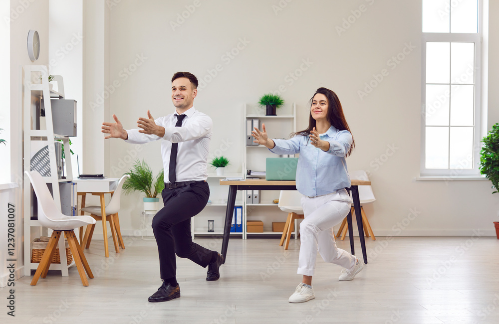 Office yoga, businessman, businesswoman doing fitness workplace in squat pose, happy meditating in modern office, feel comfort at workplace, relieving stress at work with colleague, calm successful