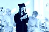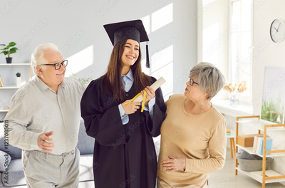 Joyful portrait of a happy elderly parents congratulate daughter, a university graduate student holding diploma. The family celebrates achievement, expressing pride and happiness in special moment.