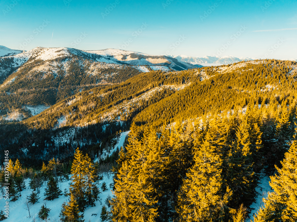 Winter hiking to Certovica in Low Tatras National park is full of beautiful views. Sunset in Slovakia mountains.