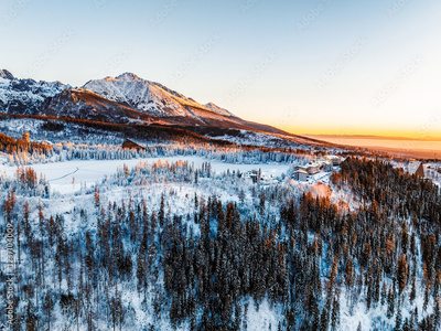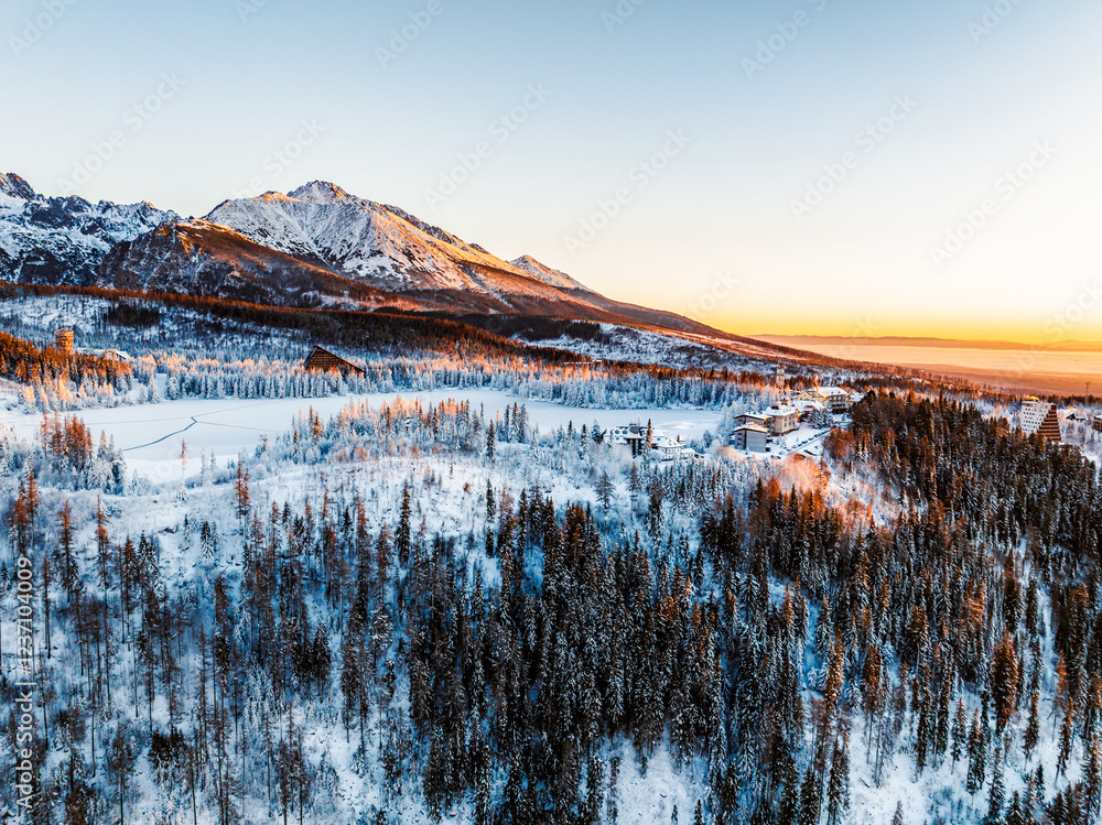 Frozen winter mountain lake Strbske pleso. Strbske lake with view of the High Tatras National Park, Slovakia