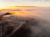 Sunset over Liptov region with and High Tatras mountains around. Misty view of tree tops with the rays of morning light.