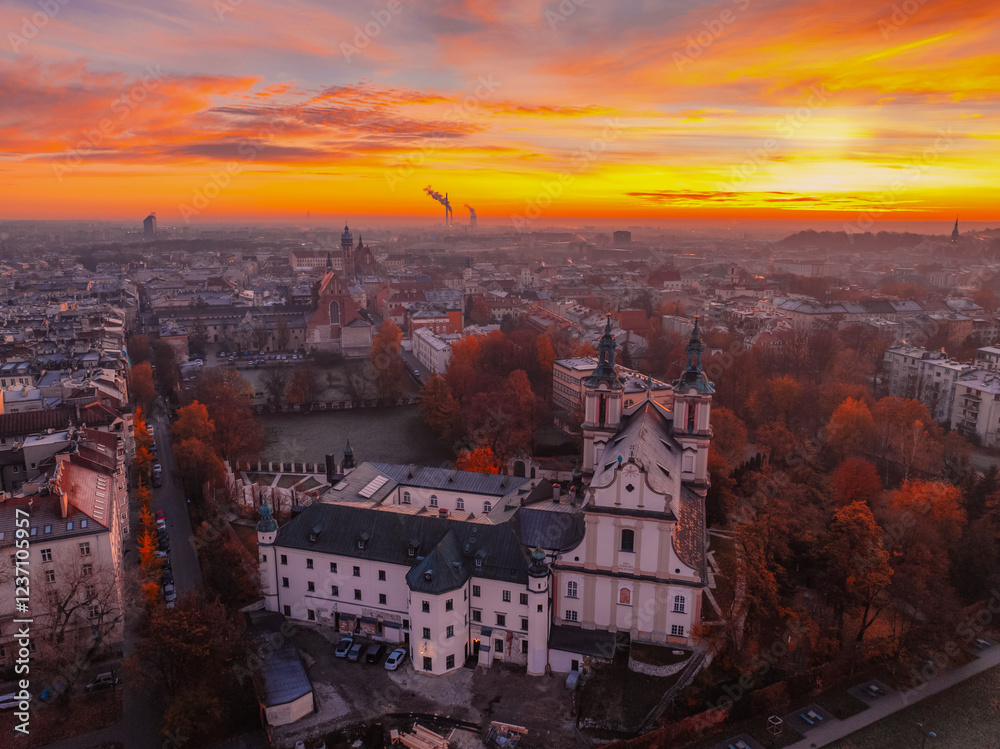 Wawel castle with Basilica of St. Michael the Archangel in Krakow Poland. Autumn landscape on coast river Wisla.