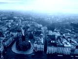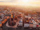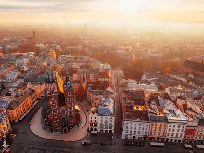 Main market Square with St. Mary's Basilica, city view in Krakow Poland. Autumn landscape.