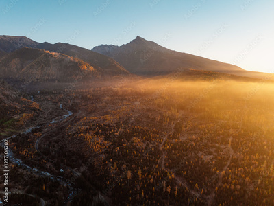 Sunset over Liptov region with and High Tatras mountains around. Krivan landspace, slovakia. Podbanske.