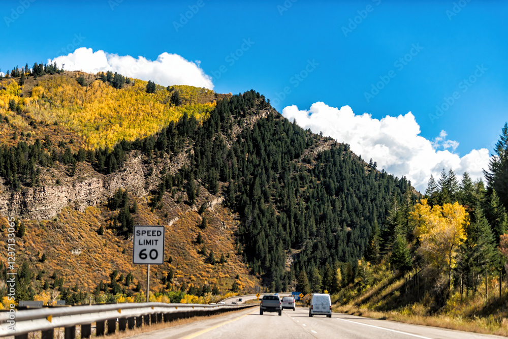 Road highway through Colorado towns to Vail in rocky mountains with cars on street and scenic views of fall autumn foliage