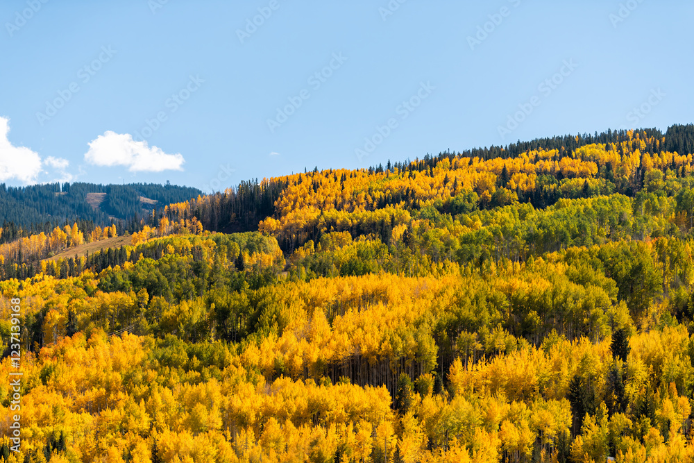 Quaking Aspen trees forest in Vail Colorado in autumn fall golden yellow foliage on mountain peak with blue sky