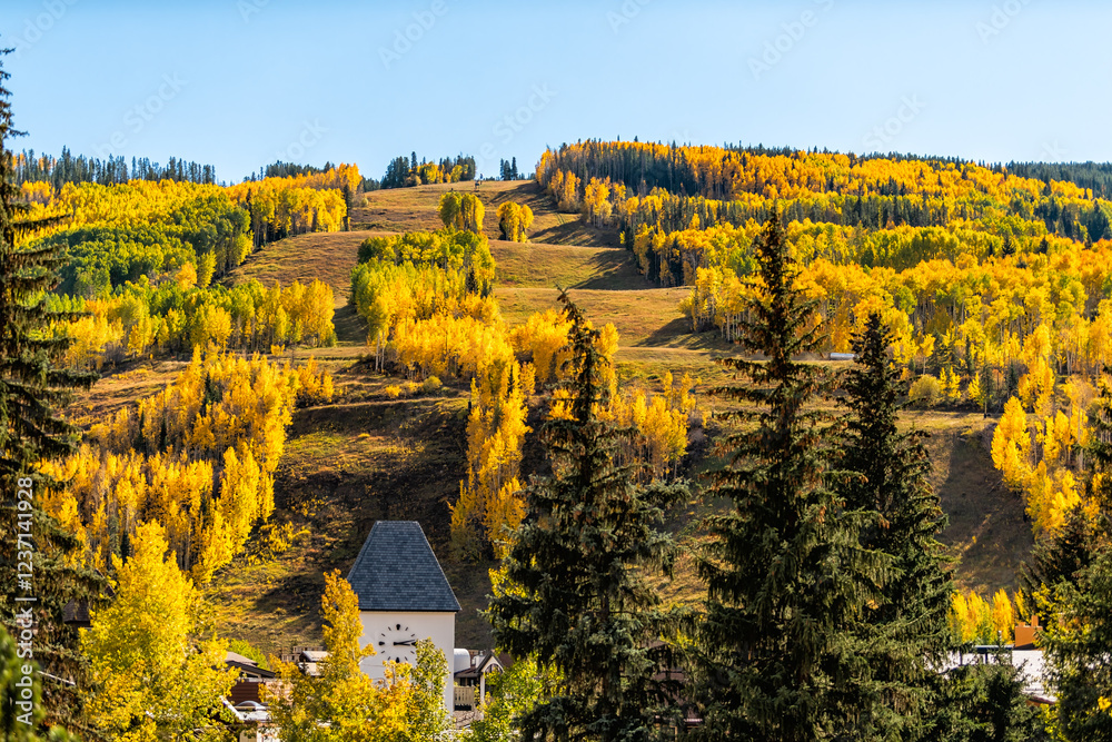 Vail Colorado ski resort town village in golden autumn fall season with tower building architecture on sunny day