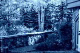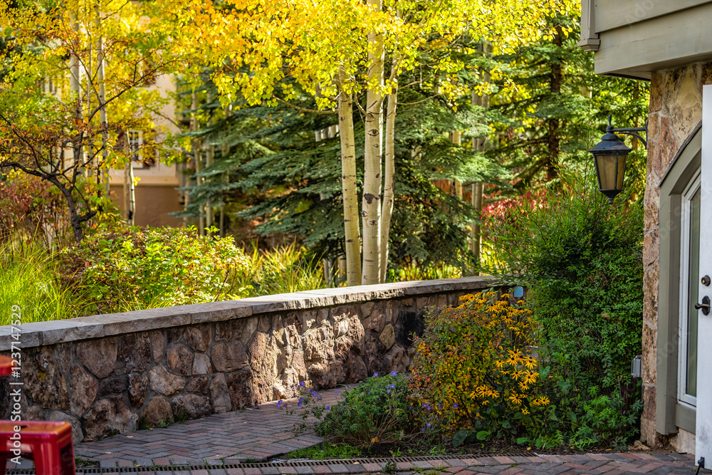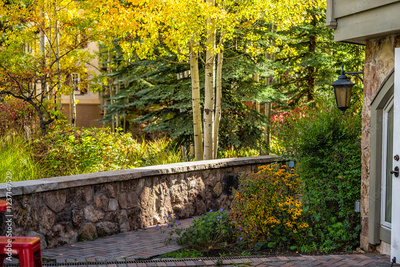 Vail Colorado backyard garden footpath of residential house building in chalet architecture autumn fall season yellow foliage