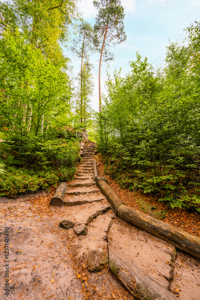 Hiking to Maria or Mariina skala wooden viewpoint built on a rock. It offers a beautiful view of the town of Jetrichovice in Bohemian Switzerland