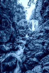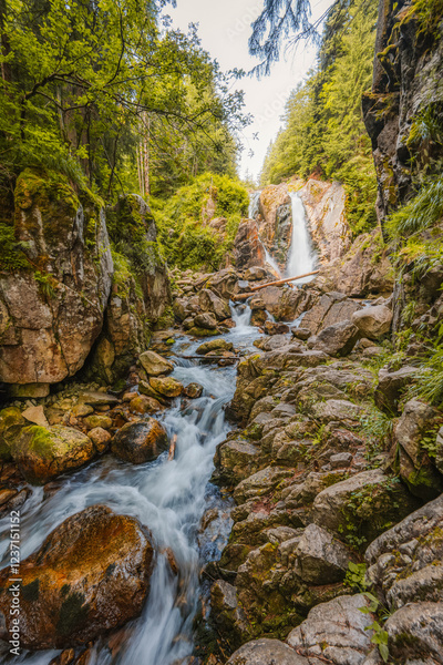 Mountain landscape in National Park Retezat, Romania. Hiking to Cascada, waterfall Lolaia