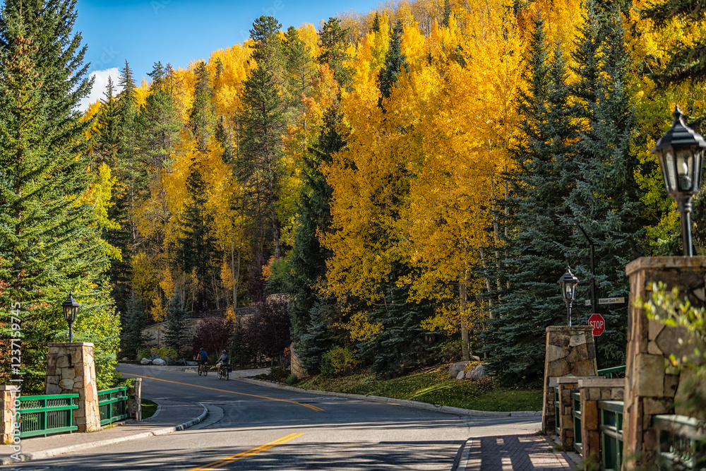 Bridge road footbridge over Gore creek in Vail, Colorado in colorful autumn fall leaf golden foliage in park