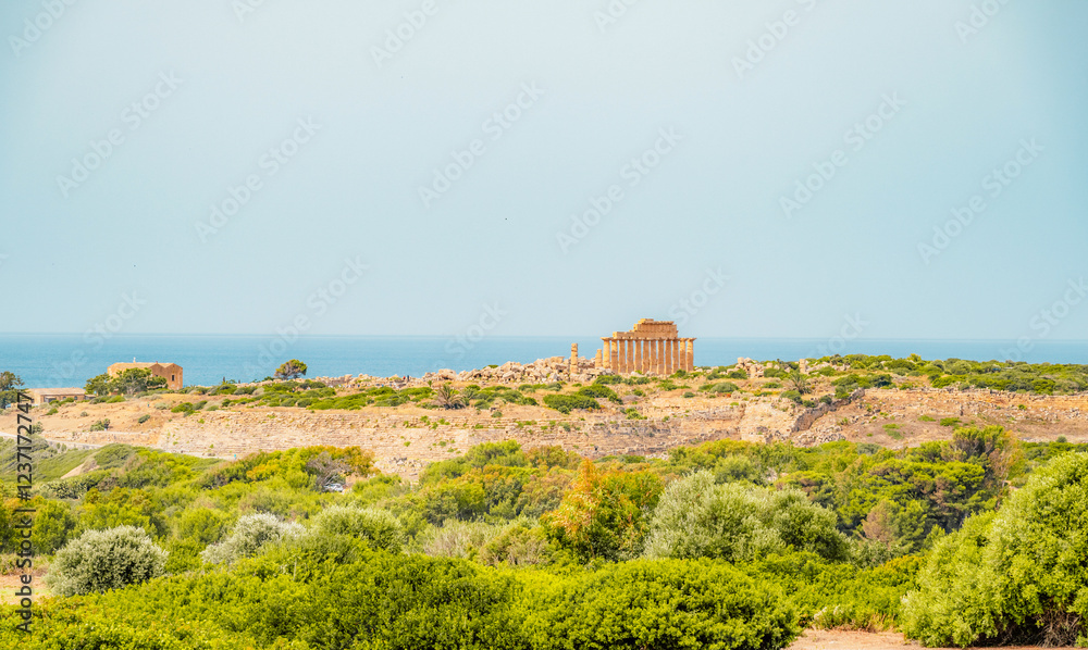 Greek temples at Selinunte of Temple of Hera Temple E with ruins of Greek columns in Selinunte Archaeological Park Sicily Italy