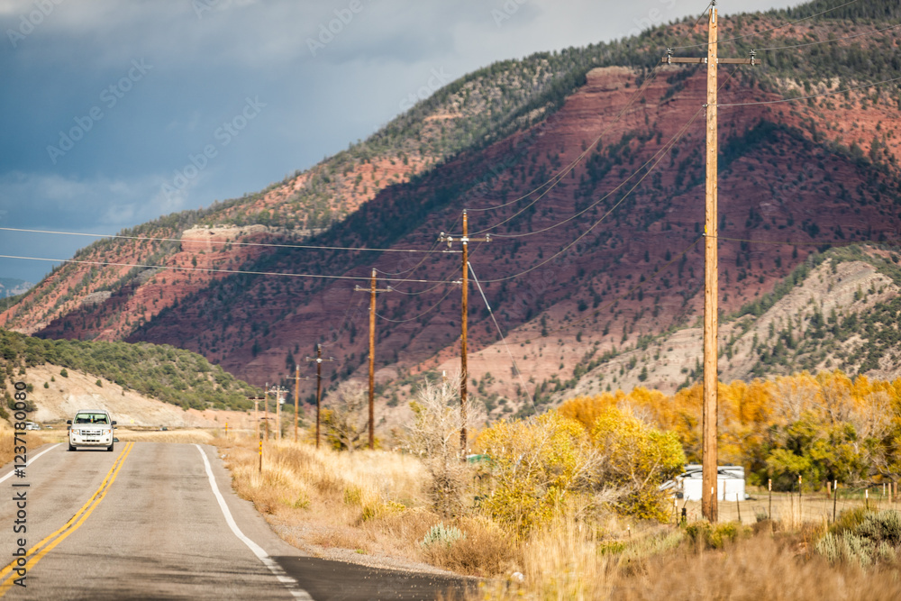 Gypsum, Colorado highway road street in Eagle county with red canyon cliff mountains on cloudy day with nobody on landscape