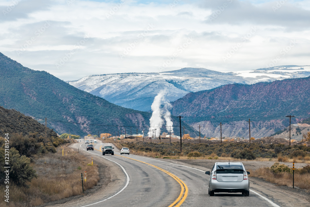 Gypsum, Colorado snow mountains landscape highway road with car driving in winter season and industrial smoke in fall