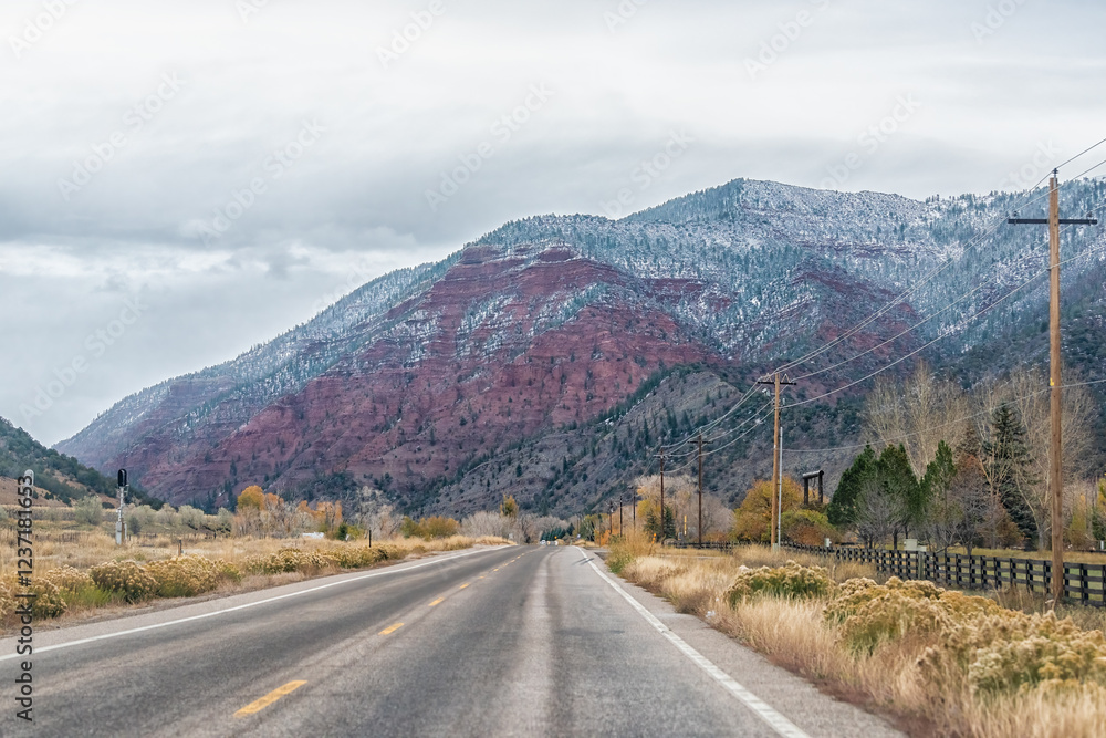 Eagle, Colorado in Eagle county with red canyon cliff mountains on cloudy snowy day landscape covered in snow in winter season