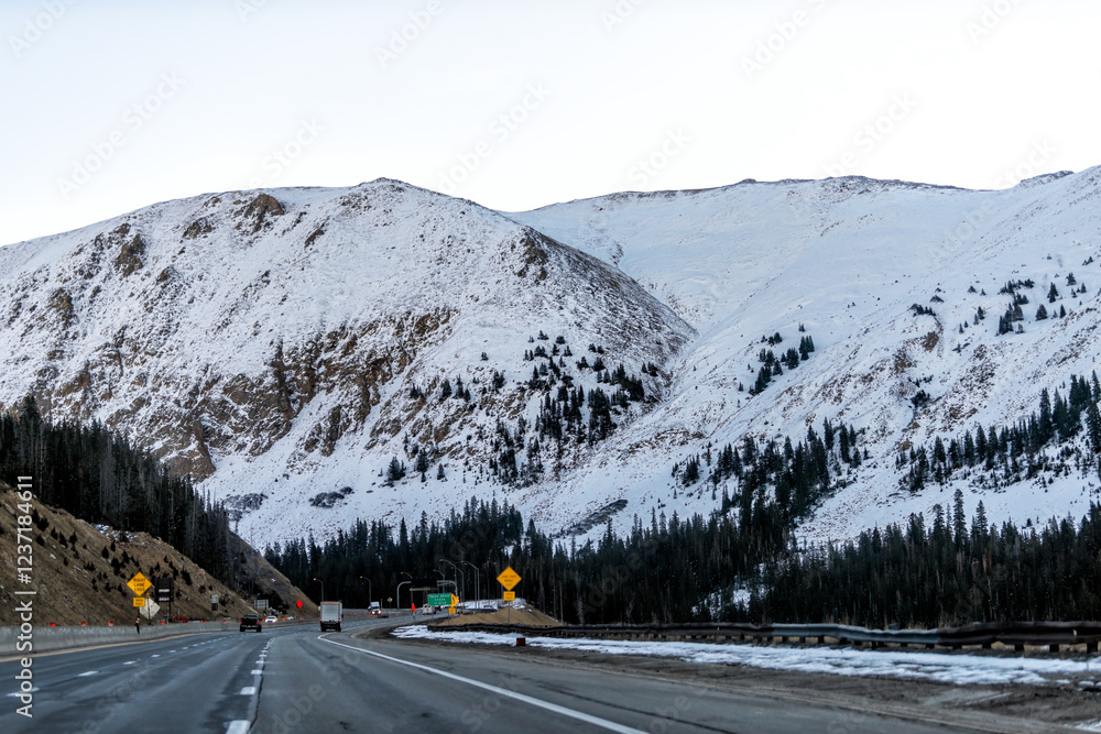 Silverthorne, Colorado snow capped rocky mountains in winter weather with highway road cars in morning with ridge