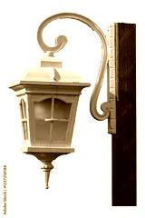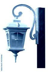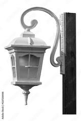 A white lamp hanging from a wooden post