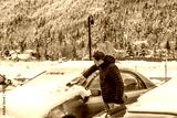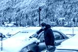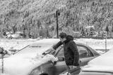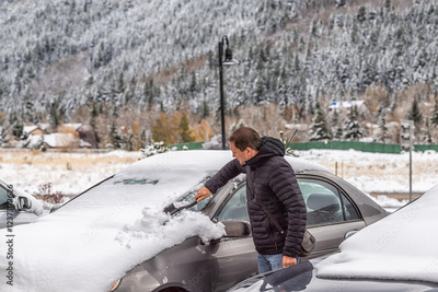 Young man on sidewalk parking lot in coat during winter snow in Colorado rocky mountains late fall season cleaning car from frost