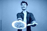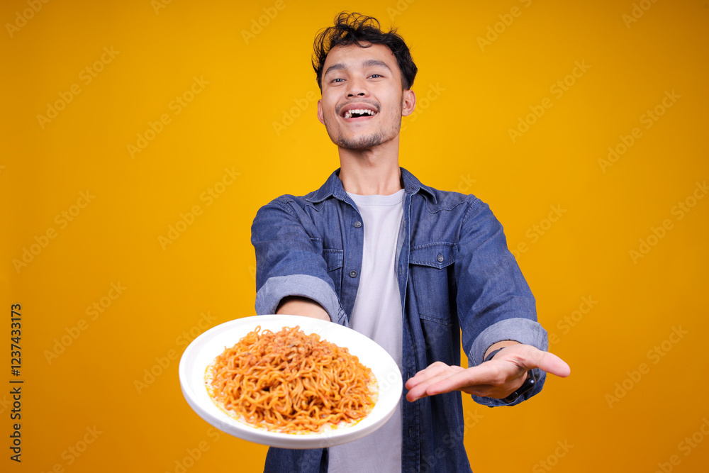 Excited Young Man Presenting A Plate Of Fried Noodle To Front On Yellow Background