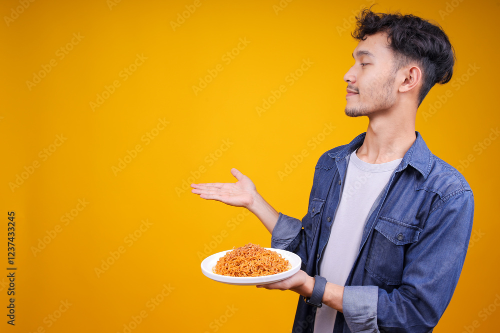 Young Man Holding A Plate Of Fried Noodle While Presenting To Ads Space On The Side Isolated On Yellow Background