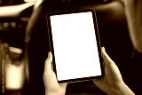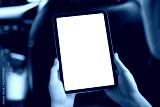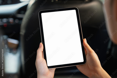 Woman sitting in a private car and hand holding digital tablet mockup of blank screen, Take your screen to put on advertising.