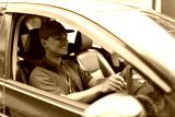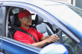 Portrait Of Deliveryman In Red Uniform Driving A Car Delivering Packages