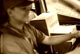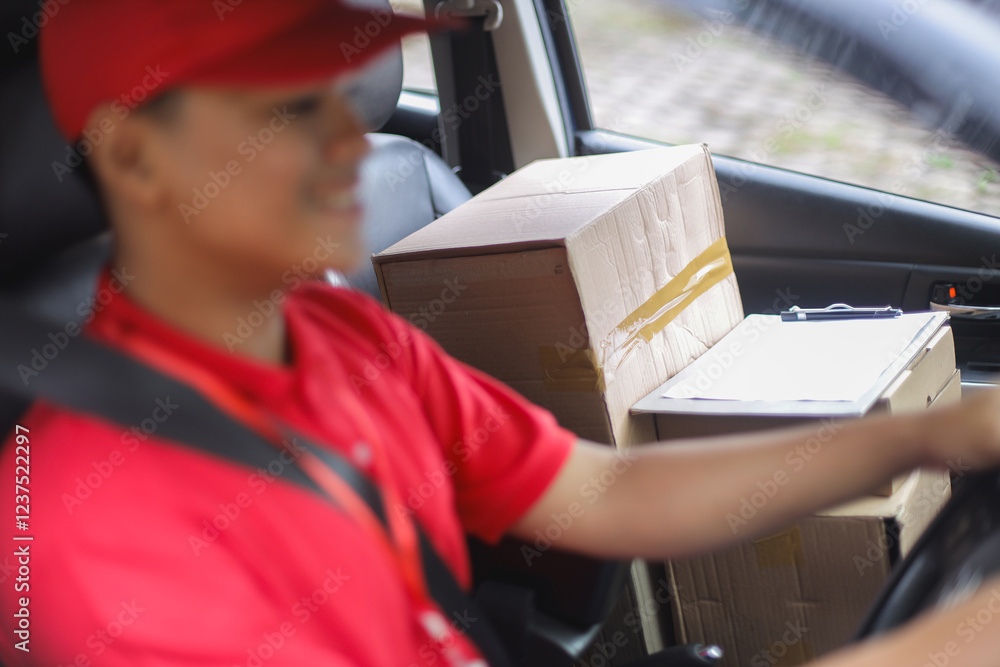 Selective Focus Of Deliveryman Driving To Delivering Package Box