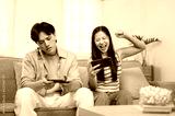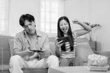 A joyful Asian couple enjoys racing a game on their smartphone, spending fun time at home together.