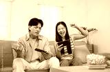 A lovely, joyful Asian couple enjoys racing a game on their smartphone, spending fun time together.