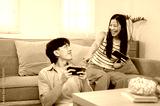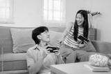 An overjoyed, happy Asian couple enjoys playing a racing game on their smartphones together.