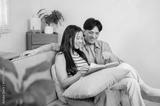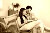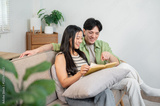A happy young Asian couple, a boyfriend and girlfriend, enjoy reading a book together on the sofa.