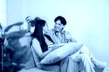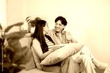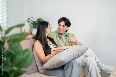 A happy Asian couple smiles at each other while enjoy reading a book together on the sofa.