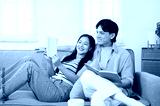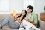 A cozy young Asian married couple enjoys a great time together at home, reading books on the sofa.