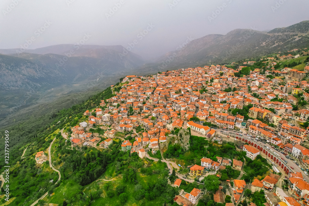 Aerial view of the town Arachova, Greece, near Parnassus mountain and Temple of Delphi.