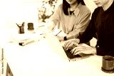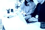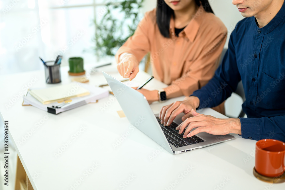 Two business partners working together at a modern office desk, analyzing data on laptop