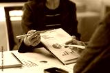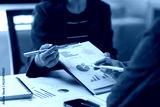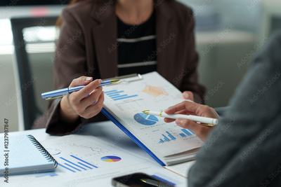 Two business professionals collaborate on analyzing detailed financial graphs and charts during a meeting, using pens to highlight key points. Documents and a smartphone are visible on the table