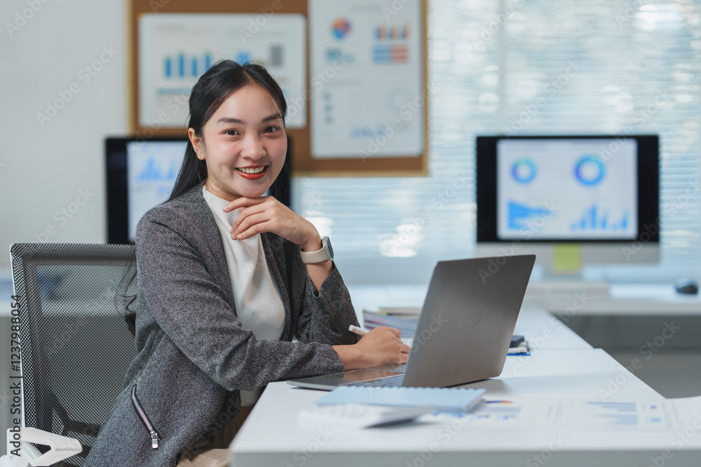 Young professional woman is sitting at desk, using laptop, analyzing graphs and charts on computer screen, working with financial data, and planning business strategy