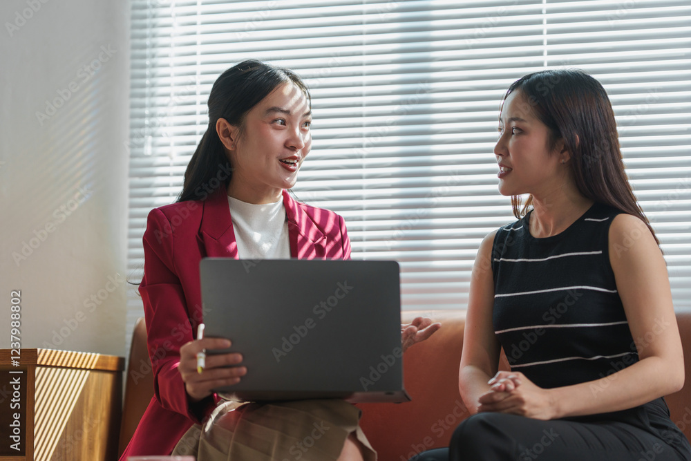 Two young businesswomen are sitting on a couch, discussing something on a laptop, actively collaborating on a project in a bright office environment